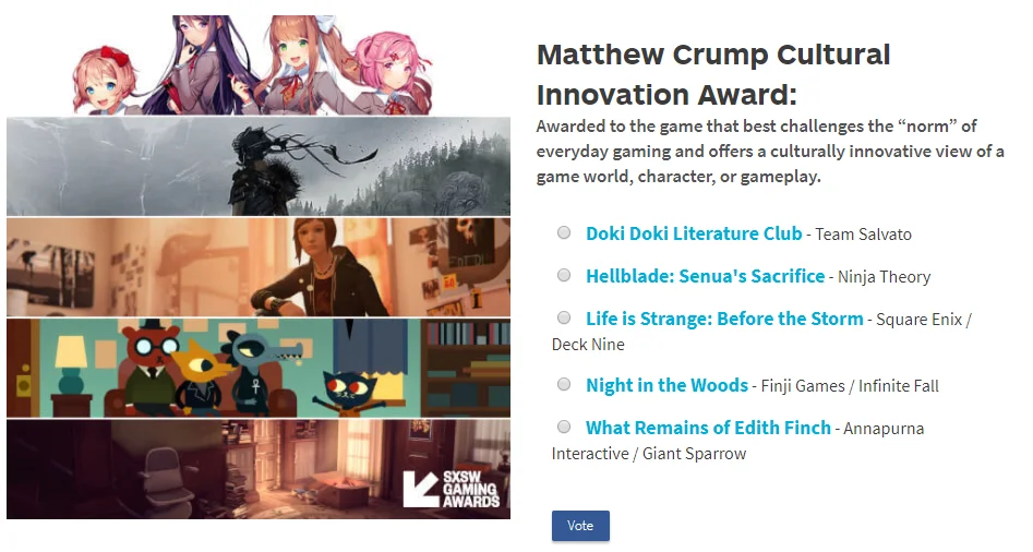 This year, DDLC was nominated for two awards in the upcoming SXSW Festival. If you want to support DDLC, follow this link to vote: