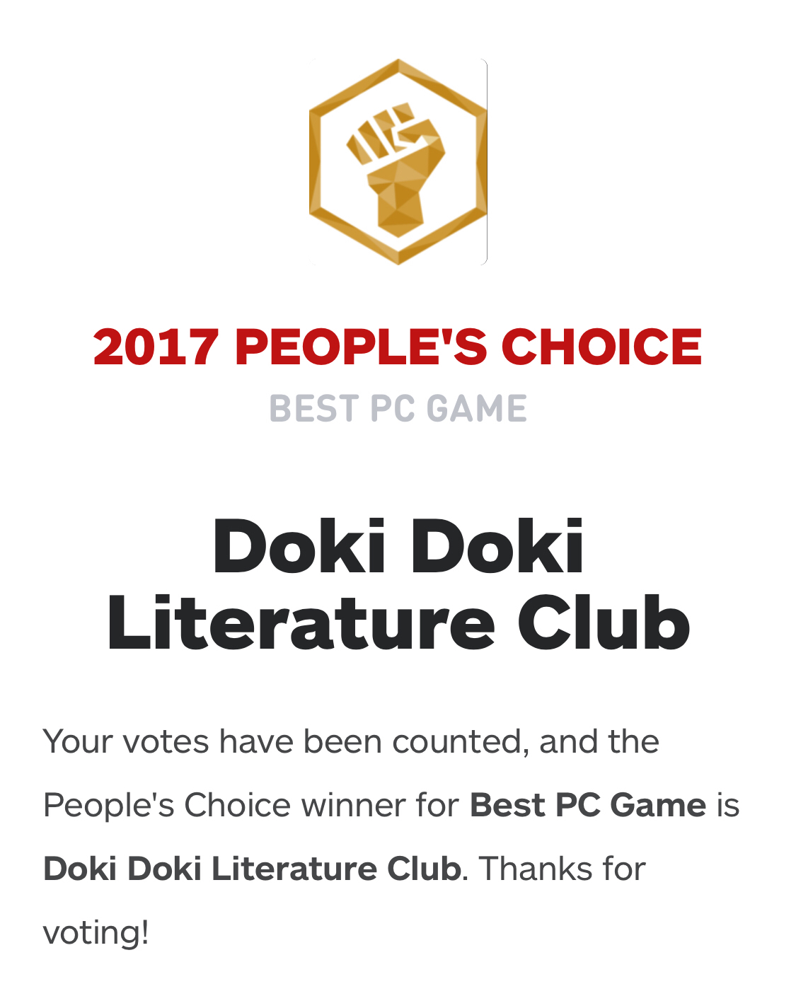 The results are in - DDLC won IGN People’s Choice (most player votes) for every category it was nominated for: Best PC Game, Best Adventure Game, Best Story, and Most Innovative. I want to thank everyone who took the time to vote, and this insane victory is a clear testament to how passionate and eager the DDLC fanbase is.